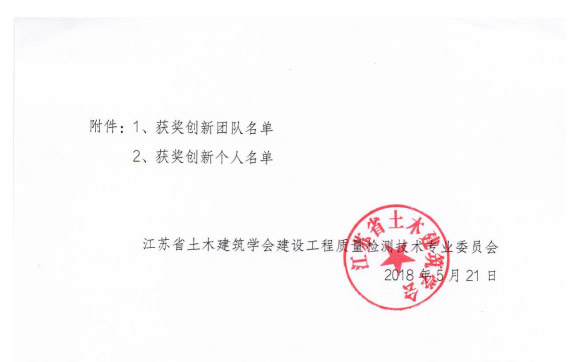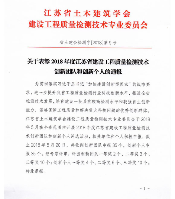 江蘇省土(tǔ)木建築學會(huì)建設工(gōng)程質量檢測技術(shù)專業(yè)委員會(huì)于2018年5月(yuè)在全省範圍内開(kāi)展2018年度江蘇省建設工(gōng)程質量檢測技術(shù)創新團隊和(hé)創新個(gè)人(rén)評選活動。鎮江市建科工(gōng)程質量檢測中心有(yǒu)限公司取得優異成績。“鎮江建科檢測研究二部”獲創新團隊三等獎,中心馬偉誠、周偉、華實等三人(rén)分(fēn)獲創新個(gè)人(rén)一、二、三等獎。這是對中心長期堅持開(kāi)展科技創新工(gōng)作的(de)肯定,更加激勵中心上(shàng)下以更大(dà)熱(rè)情投身科研工(gōng)作!